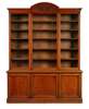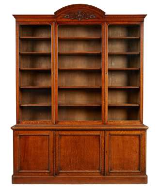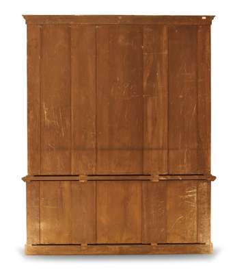 the arch moulded cornice centred by a cartouche and scrolls, above three glazed doors enclosing adjustable shelves; the base with three panel cupboard doors, one enclosing drawers, on a moulded plinth