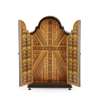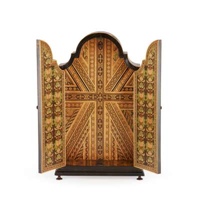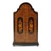 the arched top case with twin doors with oval floral panels enclosing a fully decorated interior