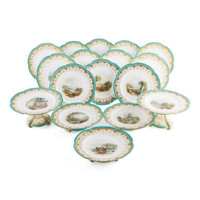 painted to the centre with pastoral landscapes or seascape scenes, with gilt and raised paste gilt decoration, enclosed within turquoise borders with gilt line rims; comprising twelve plates, two tall comports and three low comports; impressed marks and painted A7512