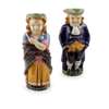 one modelled as a man in 18th century dress, standing with his hands in his pockets, wearing a blue coat and yellow waistcoat, the handle modelled as his hair tied with a ribbon, various impressed marks, numbered 1140, date mark for 1867, 28cm high; the other modelled as a lady holding a fan and wearing a shawl, her blue bodice with pink trimmed sleeves; impressed factory marks, date mark for 1868,