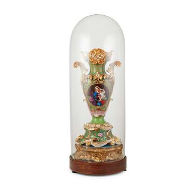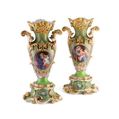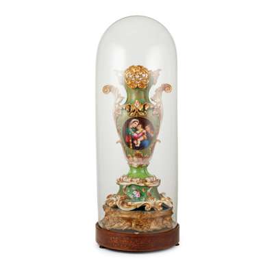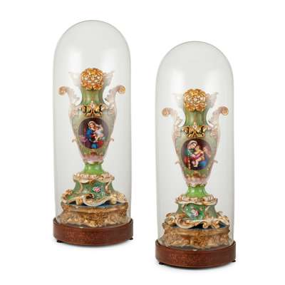 of flattened baluster form with trellis-pierced necks and scrolling acanthus handles richly enhanced with gilding, painted with circular reserves depicting Madonna with Grapes after Pierre Minyar, and La Madonna della Seggiola after Raffaello Sanzio; the reverses painted with flower bouquets, on rococo bases painted with flowers; together with shaped giltwood and gesso plinths and large glass domes on rosewood and marquetry bases