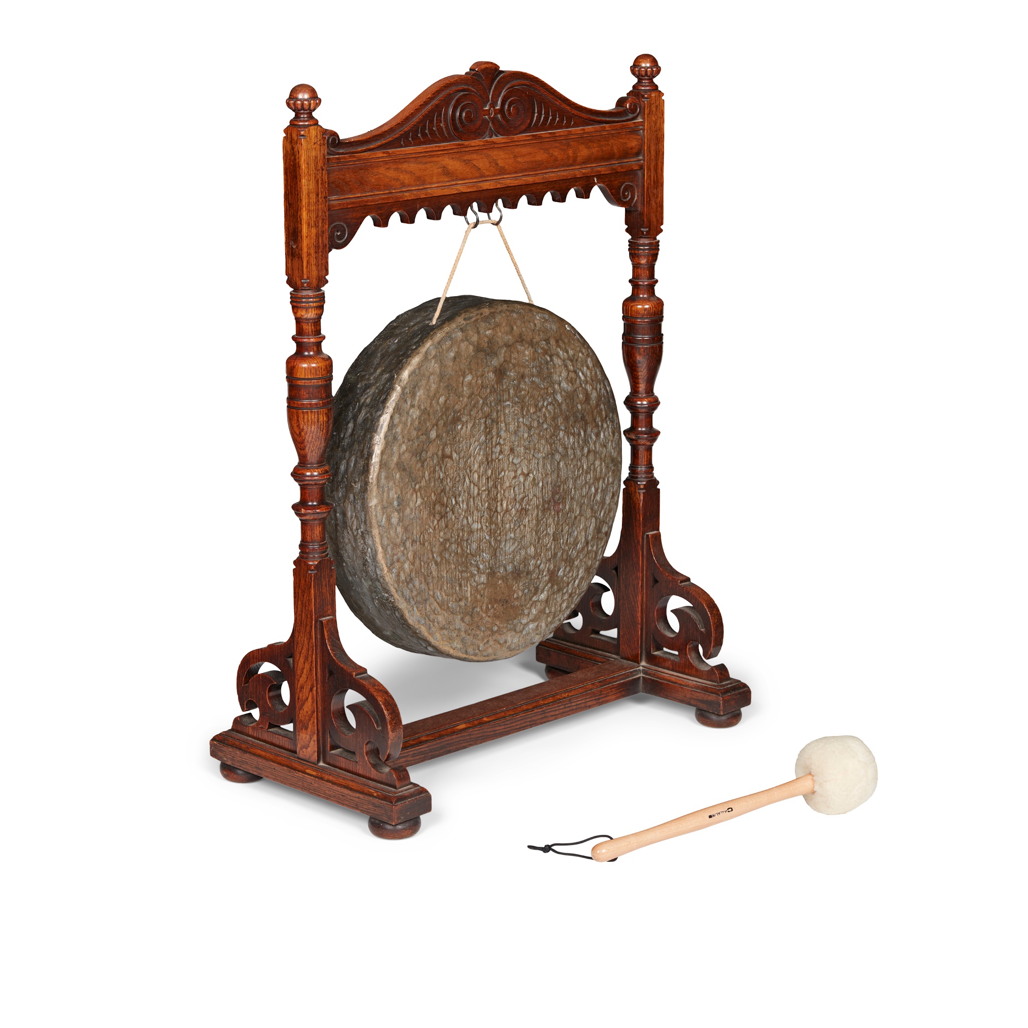 the large hammered bronze gong suspended in a frame with baluster turned uprights and scroll carved pediment, on a trestle base; with a modern beater