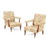 of neat size, the square backs above padded open arms with curved supports, raised on fluted tapered legs with brass castors