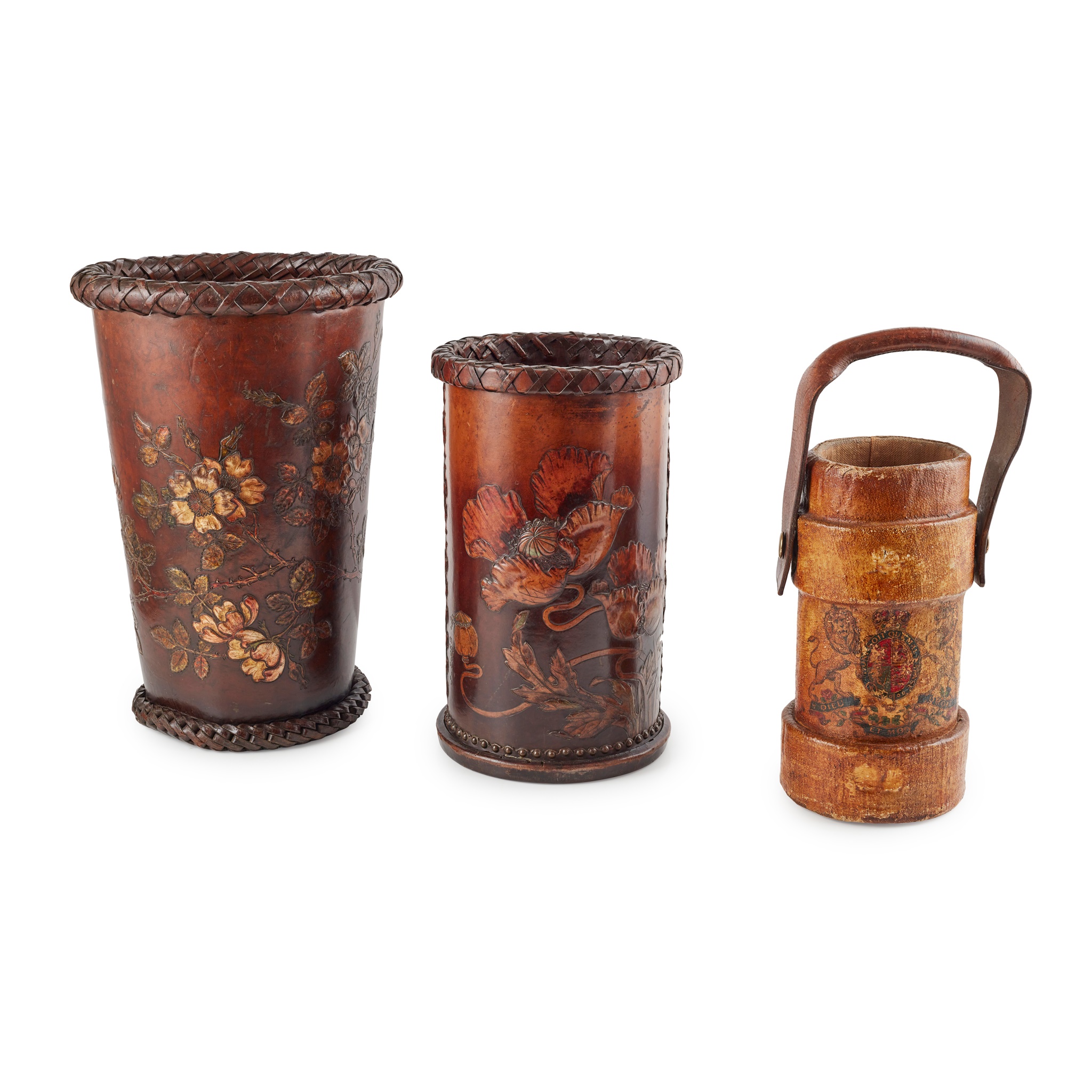 the tallest of tapering form, embossed and decorated with scrolling briars in flowers, 43cm high; a cylindrical stick stand by Georg Hulbe, embossed with poppies in the Art Nouveau taste, the leather stamped with maker's mark to the base, 37cm high; and a canvas cordite case with a print of the Royal coat of arms and motto Dieu Et Mon Droit, the leather strap handle with indistinct stamped marks