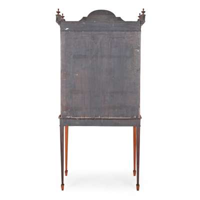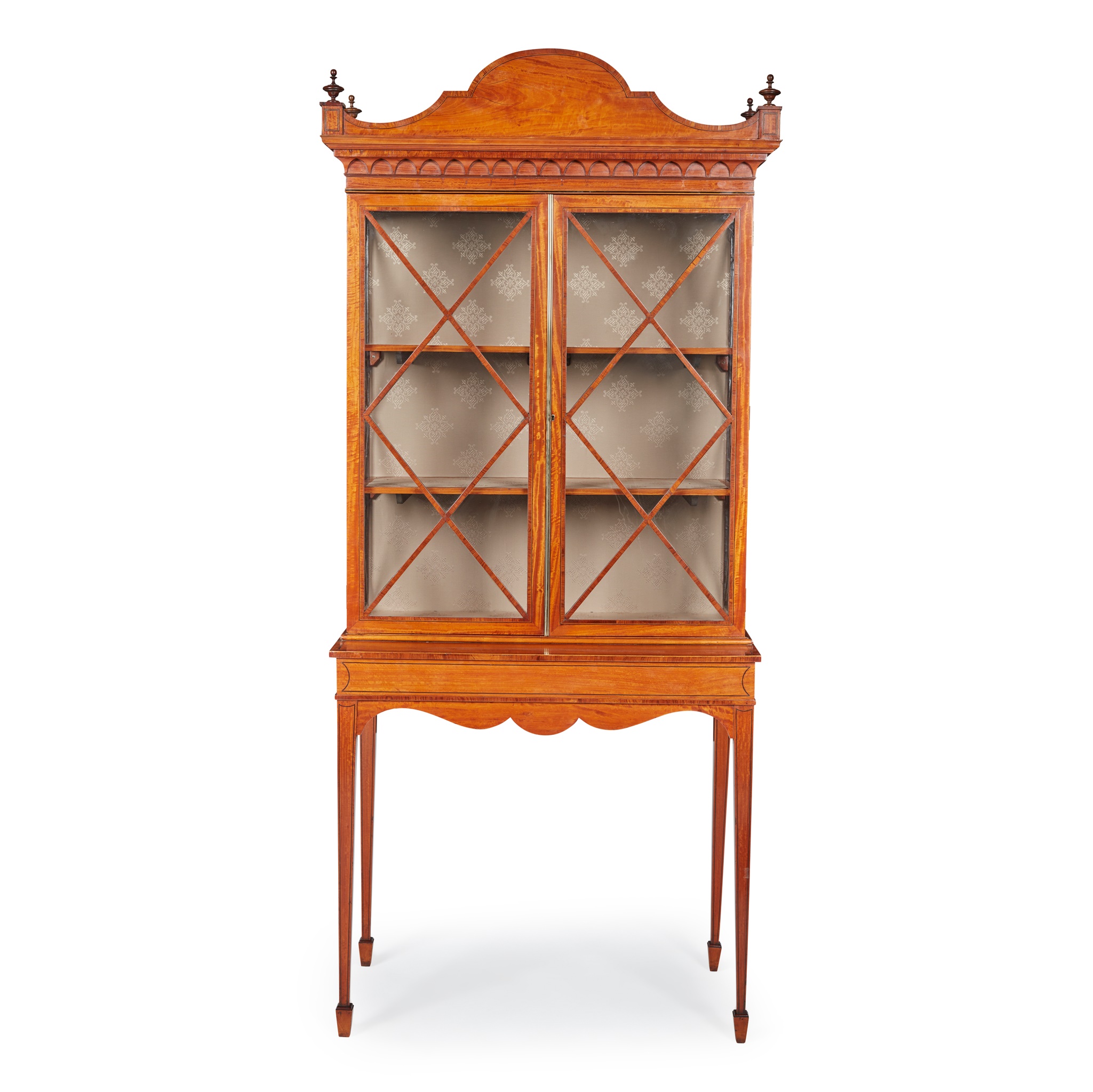 the arched and crossbanded cornice with finials to the corners above a lancet moulded frieze over glazed and mullioned doors and side panels, opening to shelves and a fabric lined interior, the projecting base outlined with further crossbanding and line inlay above a shaped frieze and raised on square tapered legs ending in spade feet
