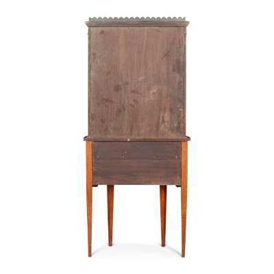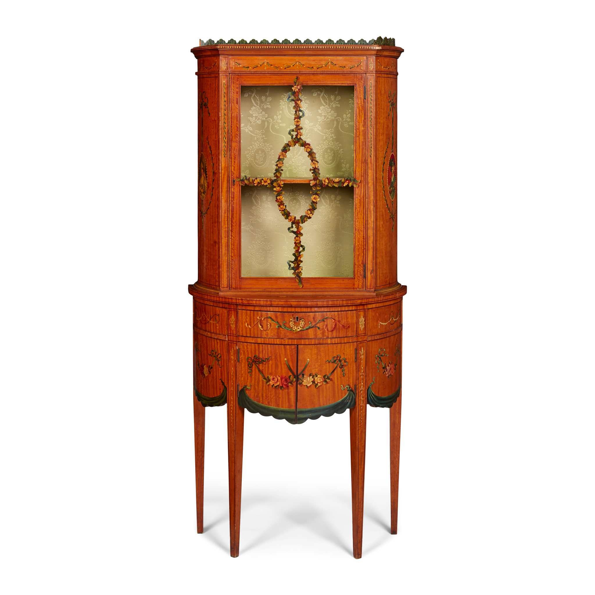 of bowfront outline, the upper part with a painted leaf tip gallery above a single door with flower garlands, opening to a shelf and fabric lined interior; the lower part with a frieze drawer and pair of shaped cupboard doors, raised on square tapered legs, painted with swags, garlands, and figural reserves
