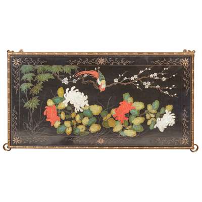 the inset lacquer panel top with chrysanthemums, prunus, and a bird, in a gilt metal simulated bamboo frame marked with rings at the corners, the legs joined by a shaped H stretcher