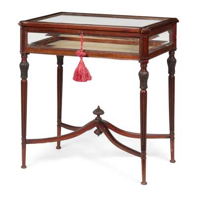 the hinged glazed top with outset corners and egg and dart moulded edge, above glazed side panels and a lined interior, raised on acanthus carved and fluted tapering legs joined by an arched cross stretcher centred by urn finials