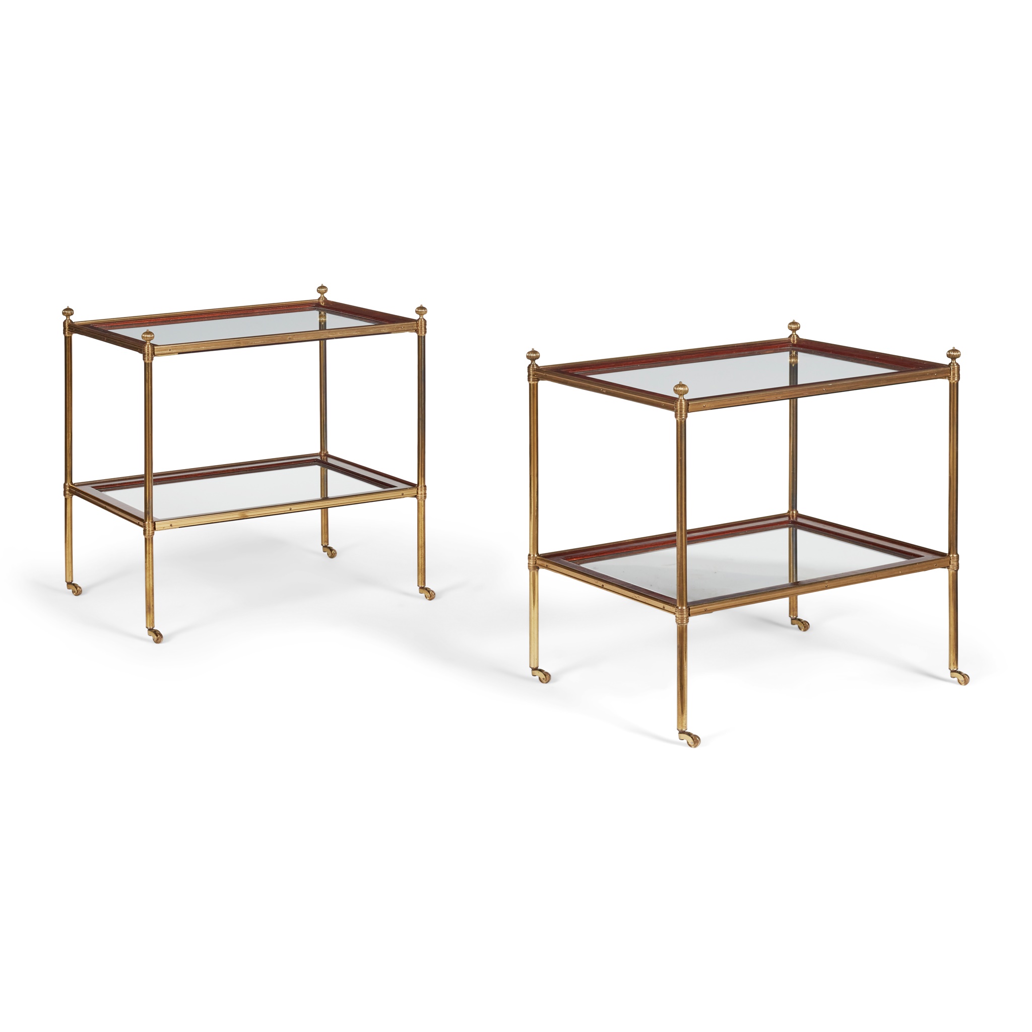 each with two bevelled glass tiers with mahogany borders, in lacquered brass frames with castors, possibly retailed by Mallet