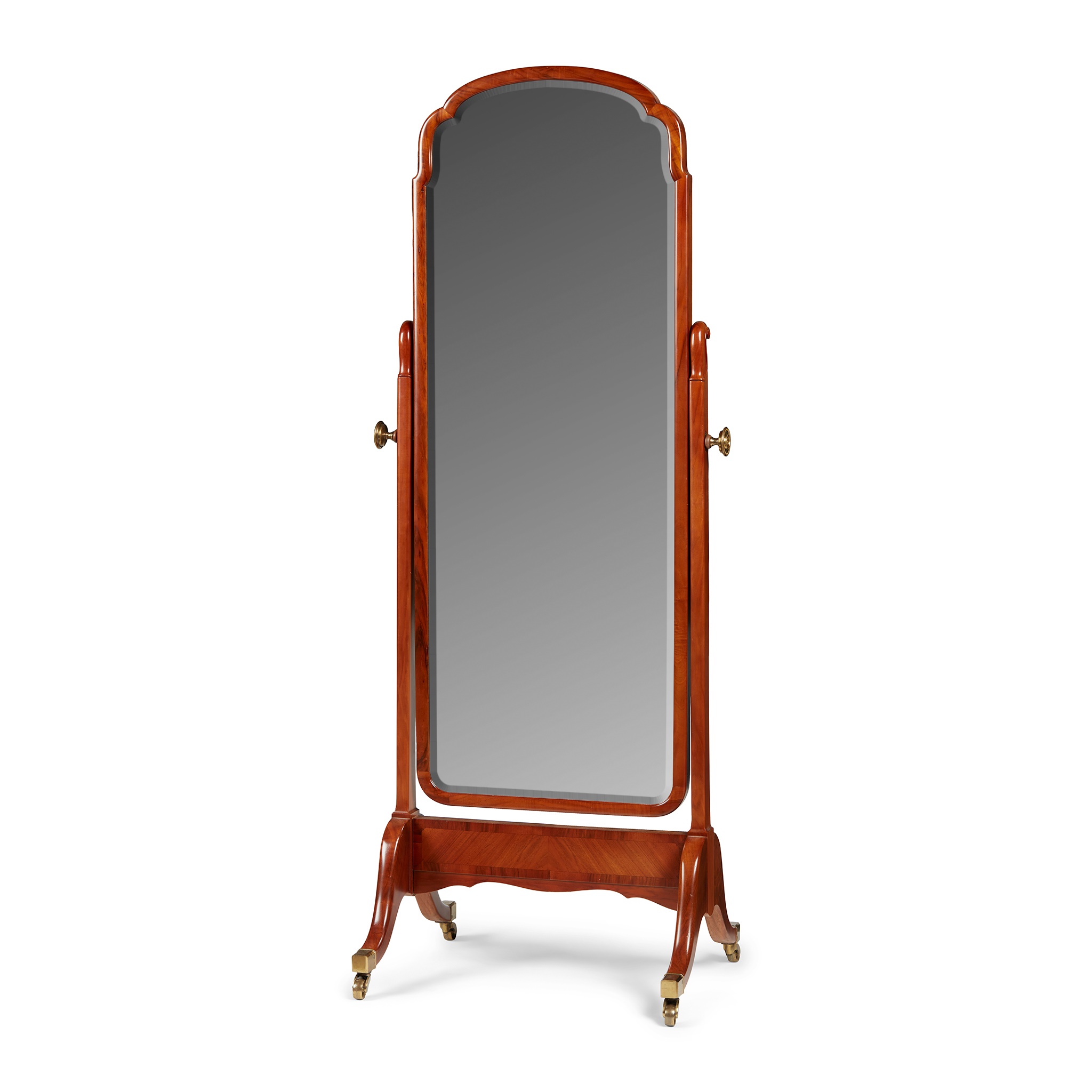 the arched bevelled mirror plate in a conforming frame and supports with scrolled terminals, on a trestle base with outswept legs ending in brass caps and castors