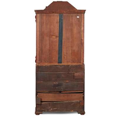 with a pair of arched glazed doors opening to shelves; the lower part with a slope front opening to an arrangement of pigeon holes and drawers and a sliding recess; over two short and two long drawers; the whole covered in flower-filled baskets, butterflies, and leaf trails