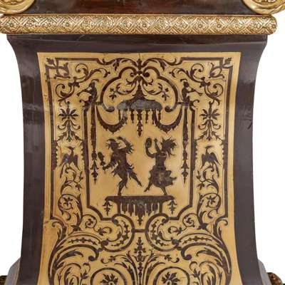 the waisted bombé case with brass and tortoiseshell marquetry after Jean Berain, the dial with white enamel hour markers surmounted by the gilt bronze figure of Chronos, with gilt bronze mounts throughout, the eight-day movement striking a bell