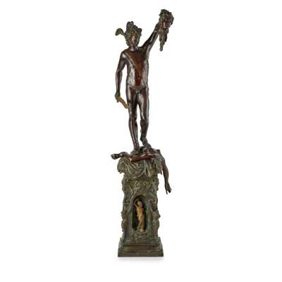 bronze, mixed patinas, on an integrated square base with four niches containing Jupiter, Mercury, Minerva and Danae with Perseus as a child
