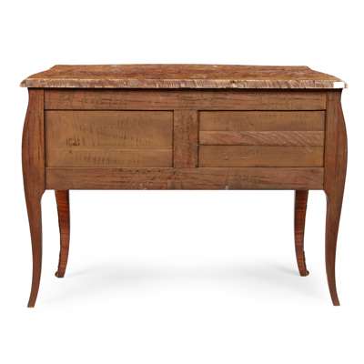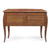 the serpentine brocatello marble top with a moulded edge over two long drawers, raised on square cabriole legs outlined with gilt metal mounts and ending in sabots