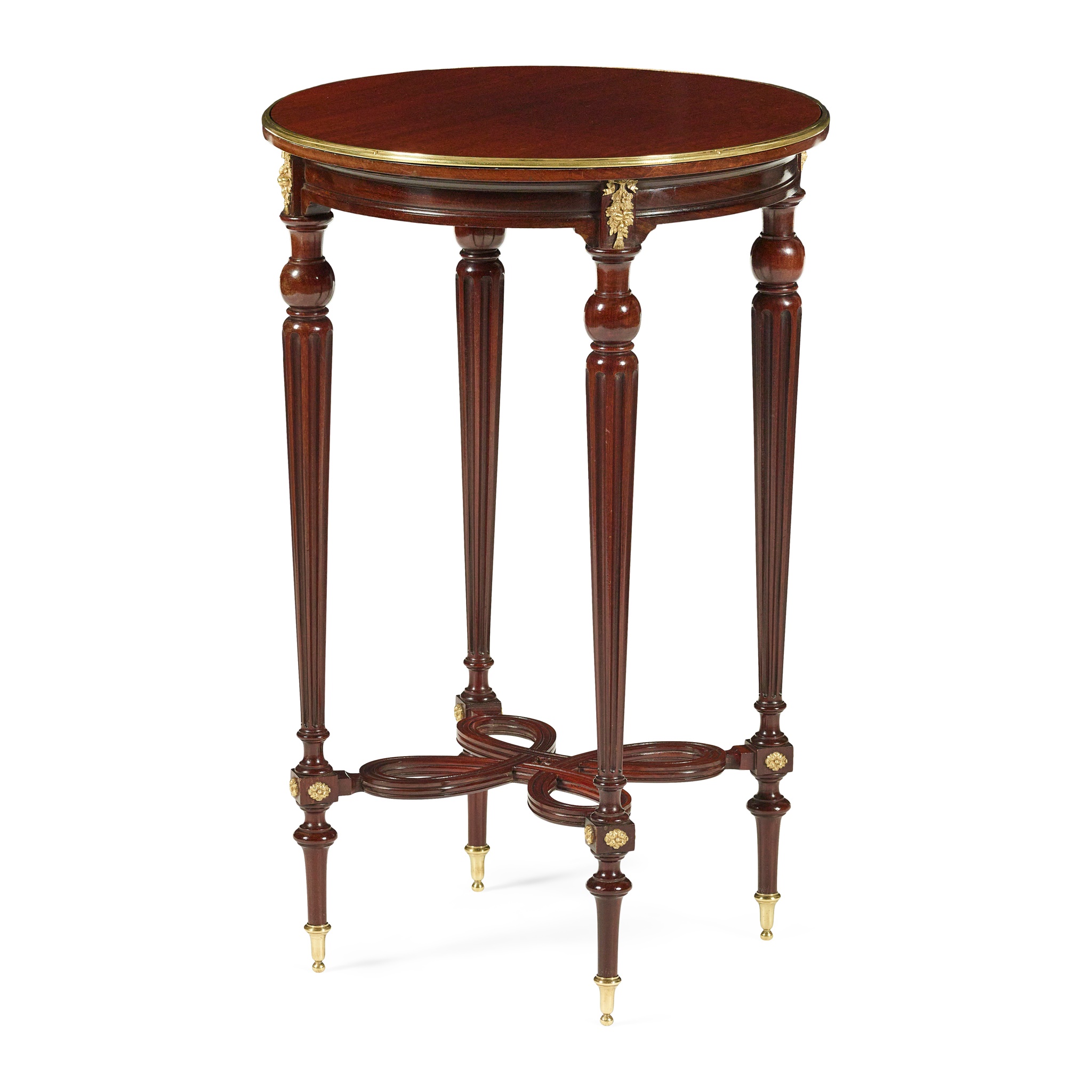 LOUIS XVI STYLE MAHOGANY AND BRASS MOUNTED GUERIDON IN THE MANNER OF ADAM WEISWEILLER, STAMPED C. MELLIER & CO.