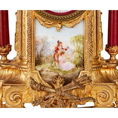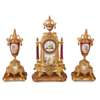 FRENCH PORCELAIN AND GILT METAL THREE PIECE CLOCK GARNITURE