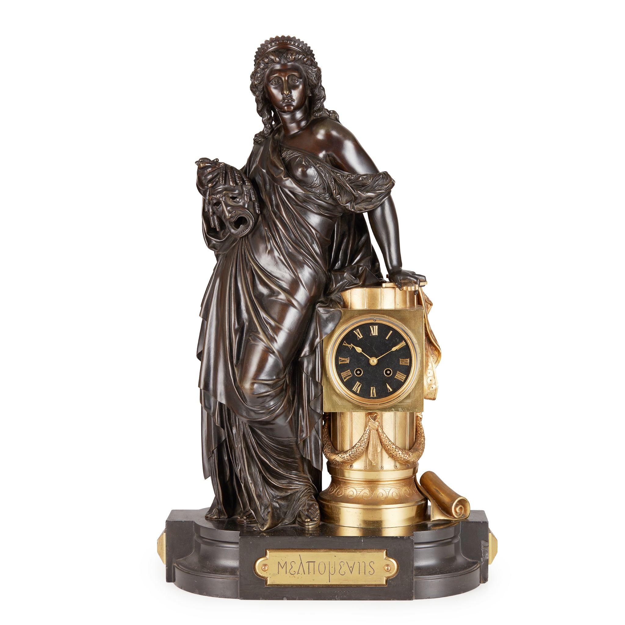 the draped figure of Melpomene with her attributes leaning against a pillar housing a black enamelled dial with applied gilt Roman numerals, the eight-day movement stamped BT MARC PARIS 38804, striking on a bell