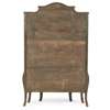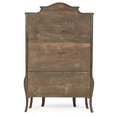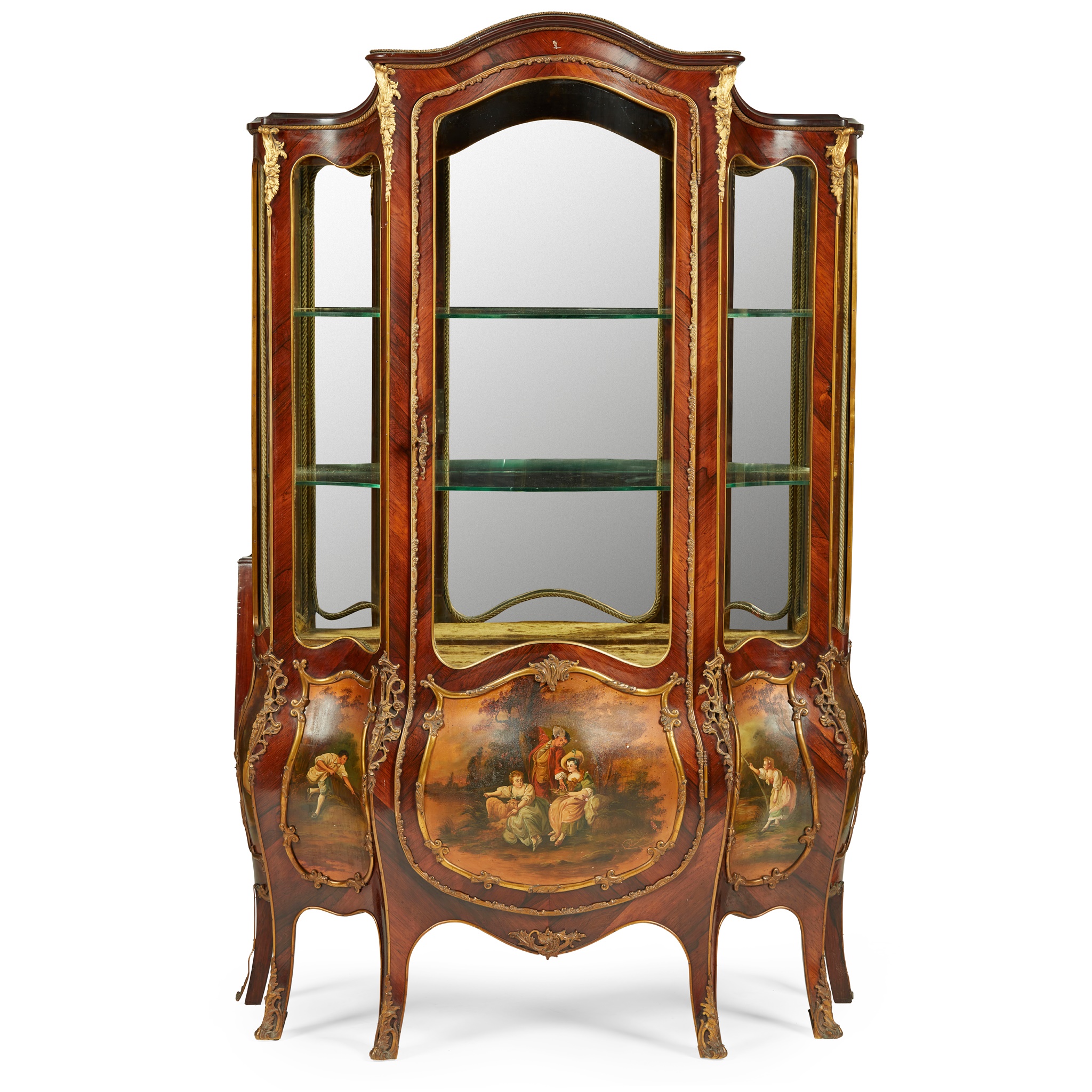 the arched cornice above a serpentine bombé door and glazed side panels over painted scenes of courting couples in pastoral landscapes, opening to glass shelves and a mirror back, raised on cabriole legs with gilt bronze sabots, the whole outlined in gilt bronze; bearing a trade label CHARLES JENNER & CO./PRINCE'S STREET/ EDINBURGH