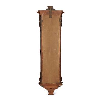 the arched cornice above a white enamel dial with Roman numerals and a single winding hole over a single brass weight and grid pendulum; in a long glazed case with ebonised mouldings