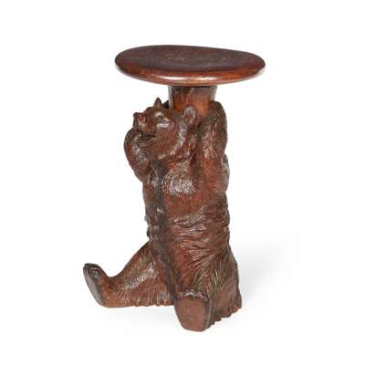the adjustable circular seat carved with oak leaves and 'INTERLAKEN', on a seated bear with glass eyes
