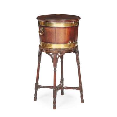 GEORGE III MAHOGANY AND BRASS BANDED WINE COOLER-ON-STAND