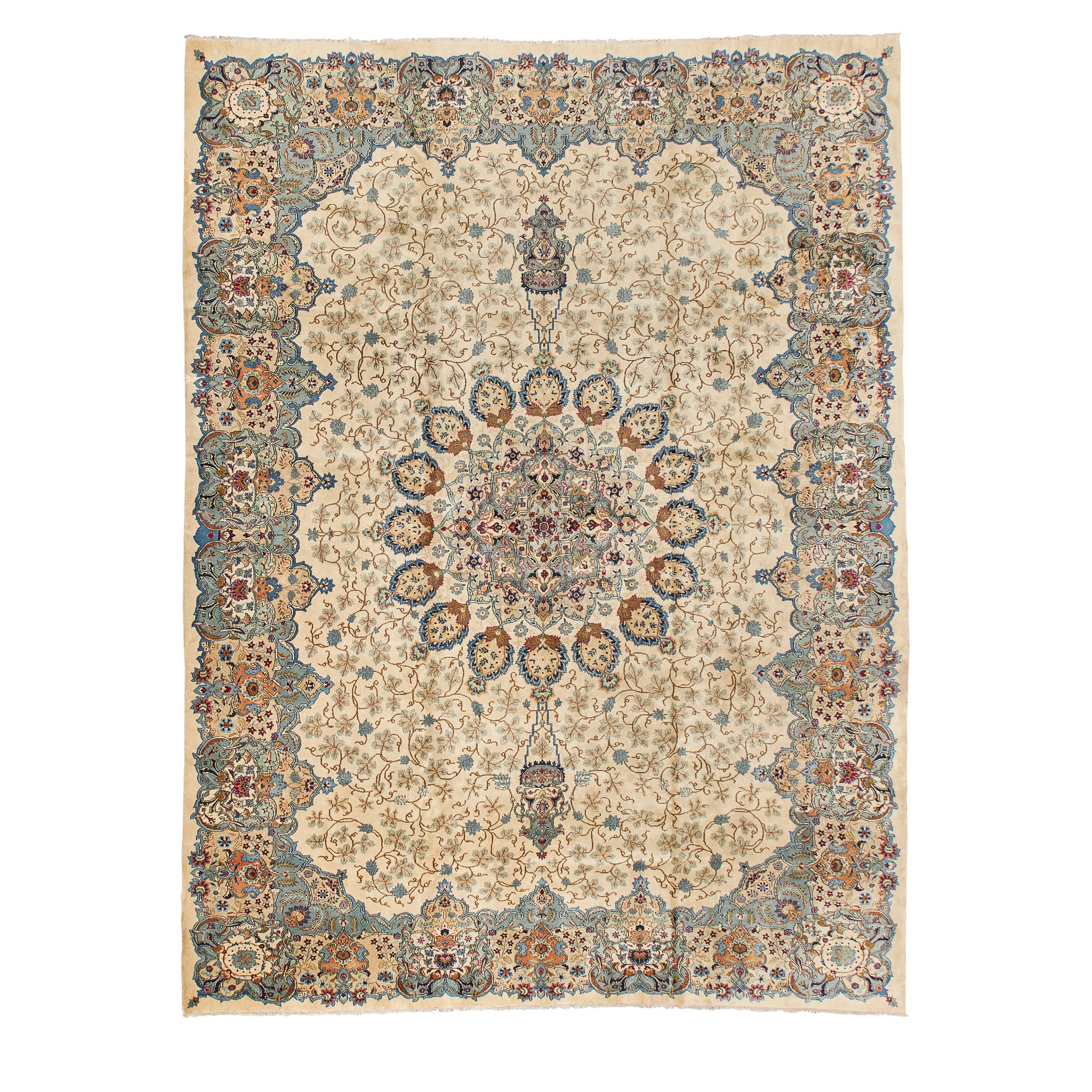 the cream field with light blue medallion suspending pendants, within blue and polychrome shaped border