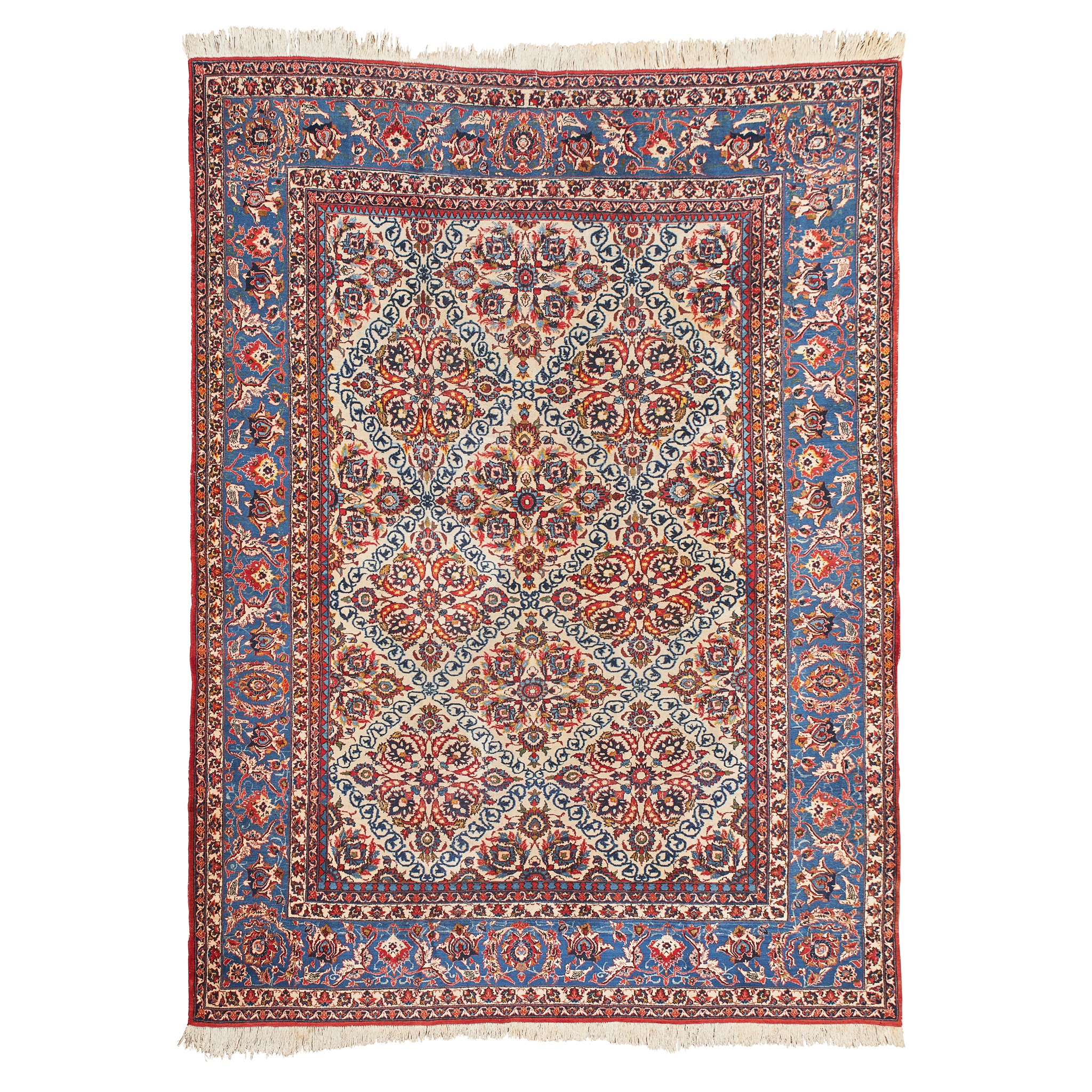the ivory field with allover palmette and foliate lattice pattern, within blue border