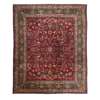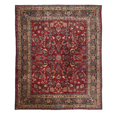 the red field with allover palmette and foliate pattern, within indigo border, signed to one end