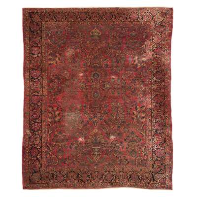 the raspberry field with allover floral and foliate pattern, within indigo border