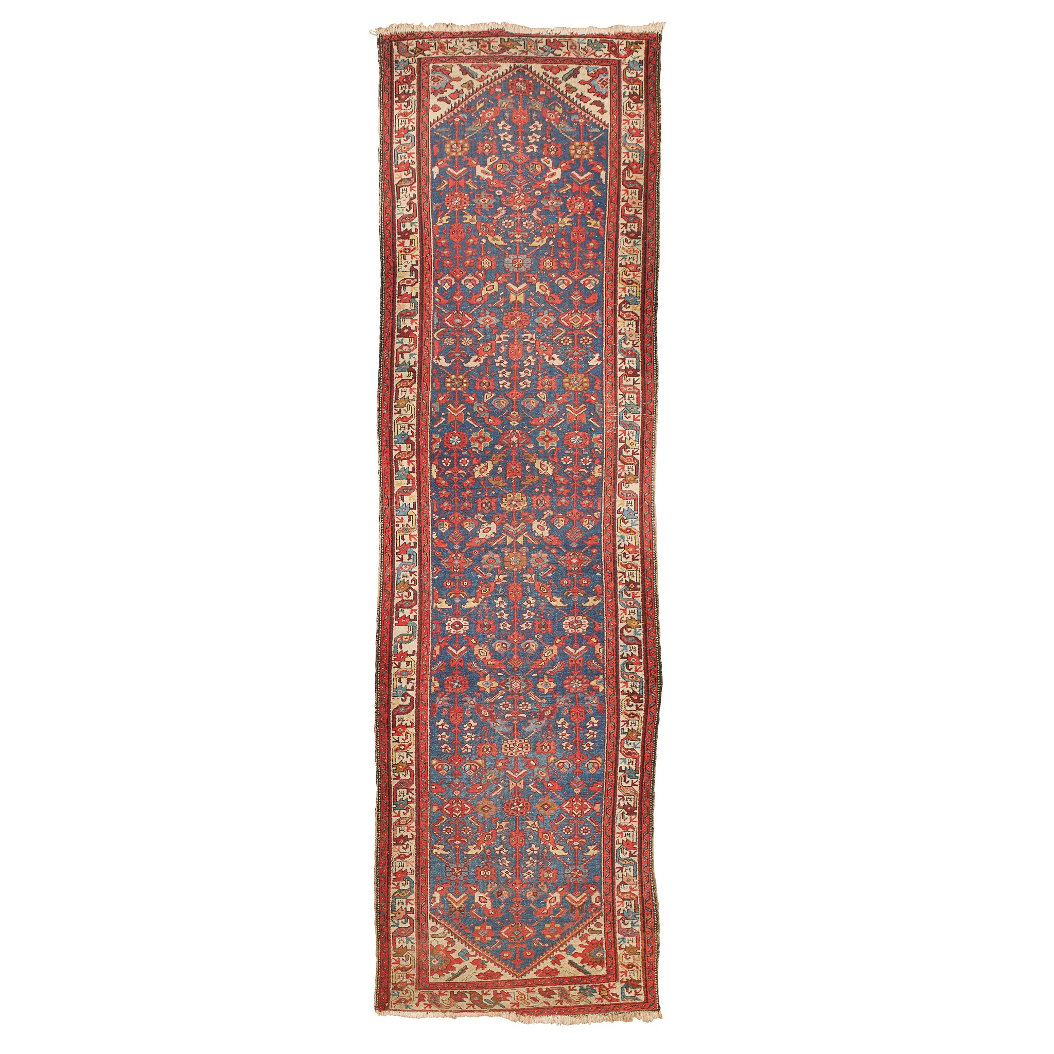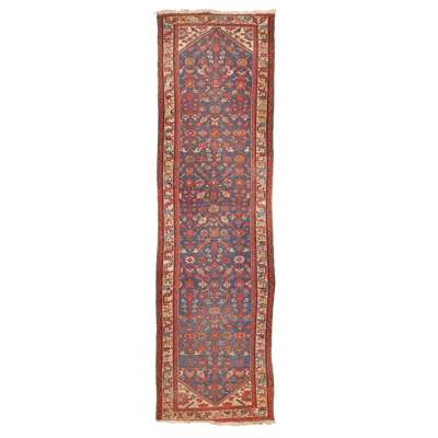 the indigo field with allover herati pattern, ivory spandrels, within ivory border