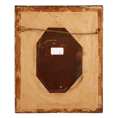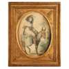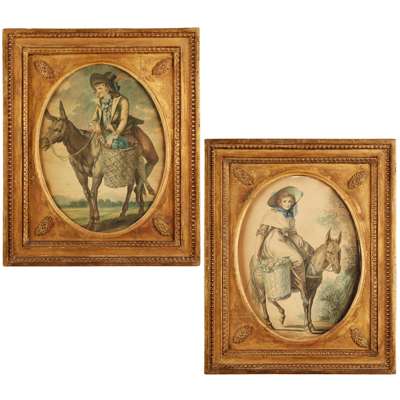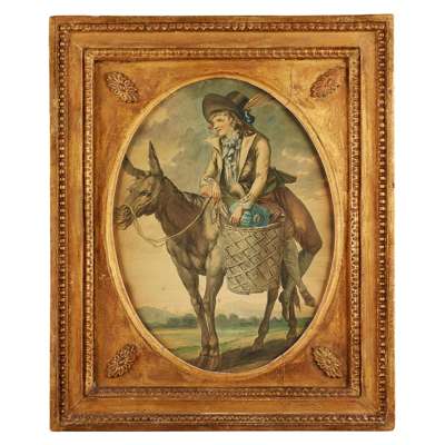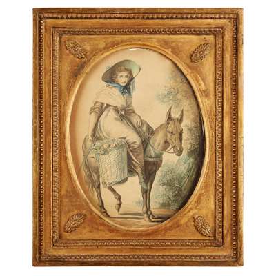 watercolour on card, oval, depicting a young man seated on a mule with a basket of vegetables, his companion seated on a donkey with a basket of flowers, in period gilt and gesso frames