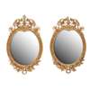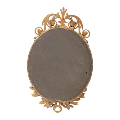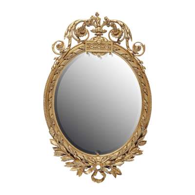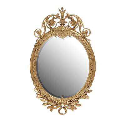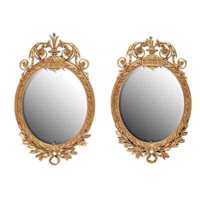 the bevelled oval mirror plates in ribbon tied giltwood frames with scrolling foliate cresting and pendant trophies with laurel boughs