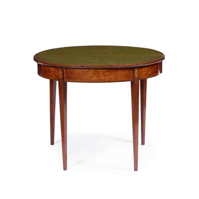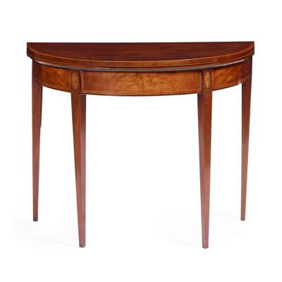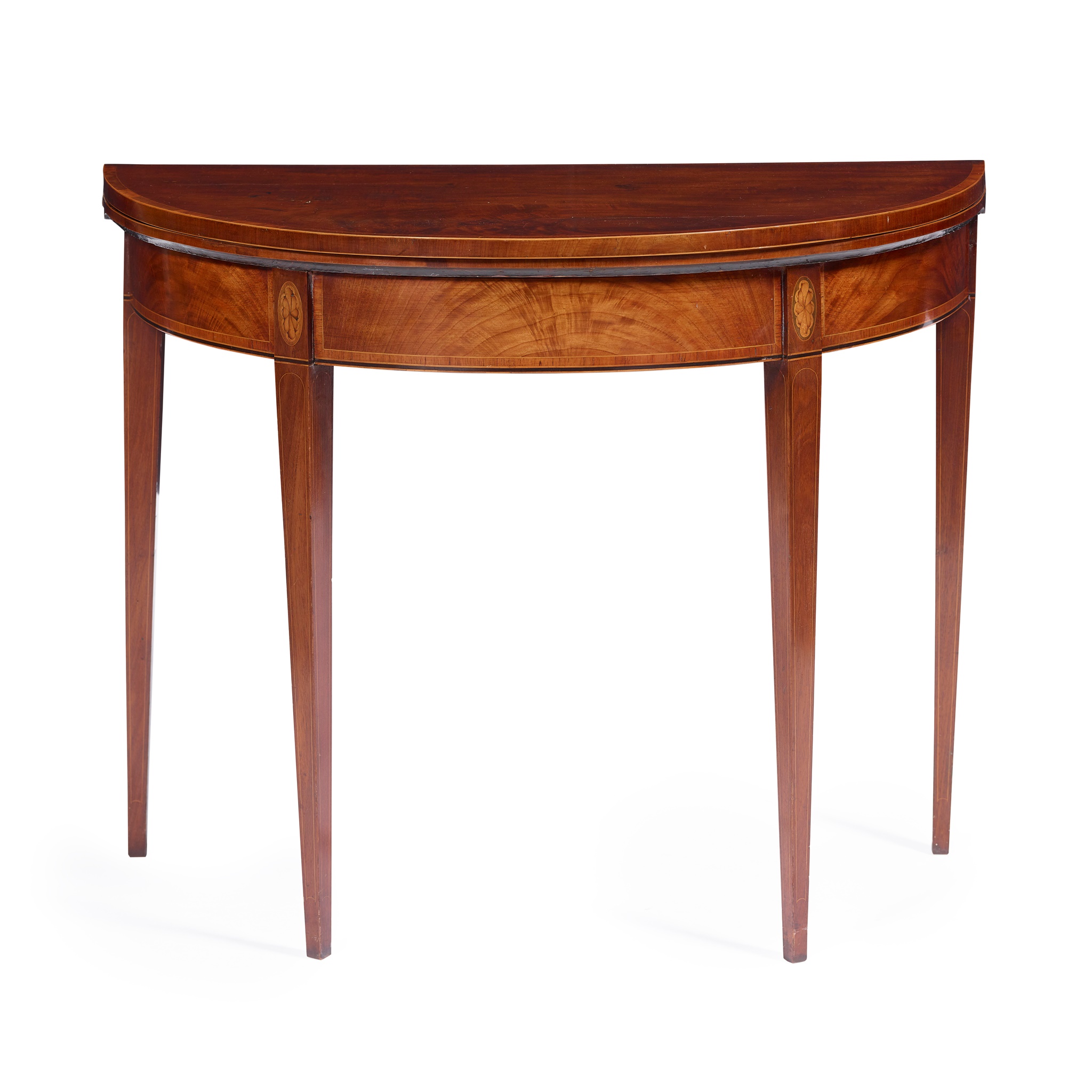 GEORGE III MAHOGANY AND KINGWOOD DEMILUNE CARD TABLE