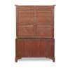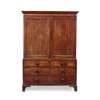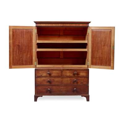 the plain cornice above a pair of bead moulded panel doors opening to three sliding trays; the base with two short and two long drawers with turned knobs and raised on bracket feet