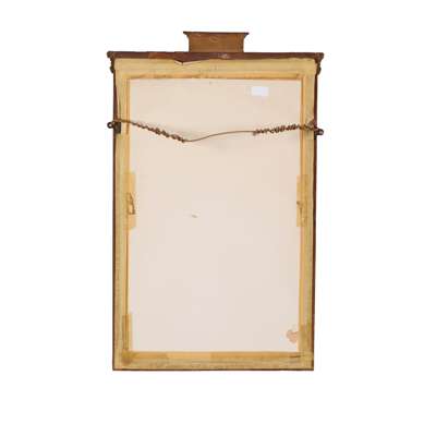 the rectangular mirror plate in a giltwood frame with an acanthus leaf moulded frieze centred by a raised tablet with a flower filled basket, flanked by reeded pilasters