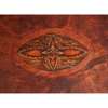 the top outlined with stringing and centred by a foliate marquetry medallion, above two short and three long drawers with pressed brass handles with figures of reclining lions, shaped bracket feet