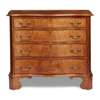 the serpentine top with a moulded edge above four long graduated drawers flanked by blind fret carved angles, raised on bracket feet