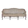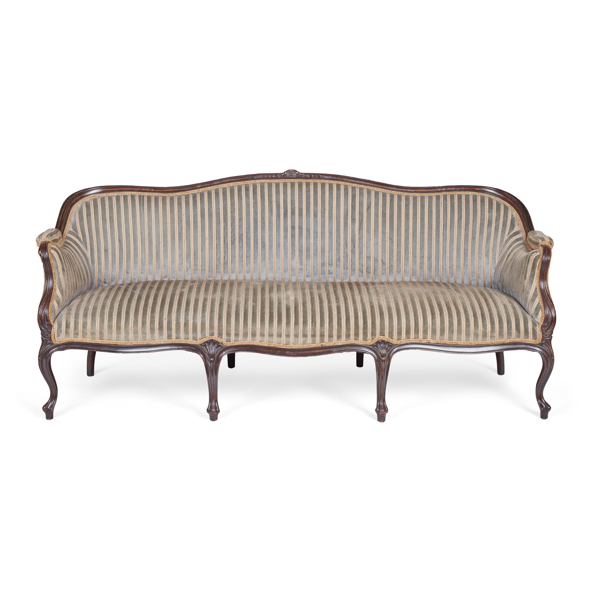 the serpentine back in a channel moulded frame centrally carved with a rosette, leading to part-padded arms above a long padded seat, raised on eight shell and scroll carved cabriole legs ending in scrolled toes; covered in pale green and gold striped plush fabric
