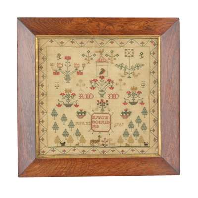 silk on linen, the first worked by Mary M[c]Donald, dated April 22 1797, with her parent's initials, flowering pots, birds, trees, and small animals, bordered by flowering vines, in a rosewood frame; the other worked by Elizabeth Ann How, dated 1797, with a central reserve with the first two Commandments, an alphabet and number series above, the field with flowering pots, trees, and animals below, within a wide border of flowering vines, framed