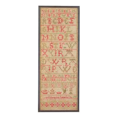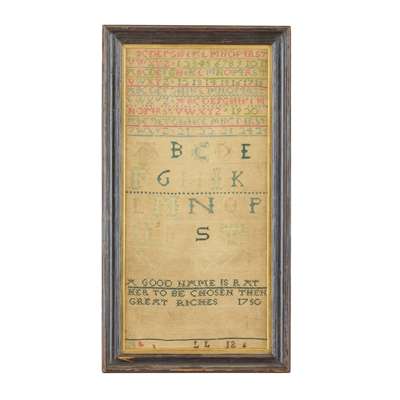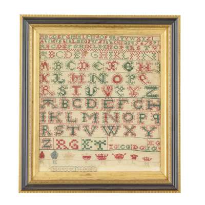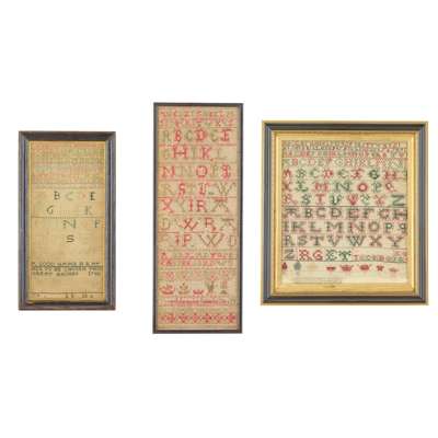 worked in cotton or silk on linen, the first with alphabets, initials, patterns, birds, and baskets, with motto 'To youth the tenderst [sic] Regards is Due', signed 'Merry Rob. aged 7. October.30.1781', framed; the next with alphabet and number series, crowned initials, and motto 'A GOOD NAME IS RAT/HER TO CHOSEN THEN GREAT RICHES' and dated 1750, framed; the last worked by Elisabeth Graham with alphabet and number series, initials, and coronets, framed