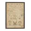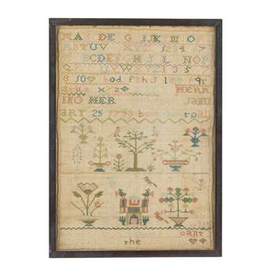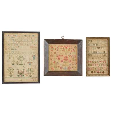 the first an alphabet sampler worked by Mary Herring, dated January 25 1793, with number and alphabet series above a field with flower pots, birds, and castle, with motto 'be kind to all' and poem 'Patterns of labour we can't want/ if we behold the busy ant', framed; a small marking sampler worked by Rebecca Baker, and inscribed 'Daughter of John Baker was born[d] February 26 1758, with initials RB, framed, 18 x 10cm; and a small spot sampler worked with flowering pots, birds, rabbit, and initials, framed, 14 x 15cm