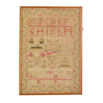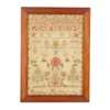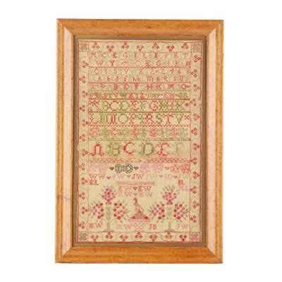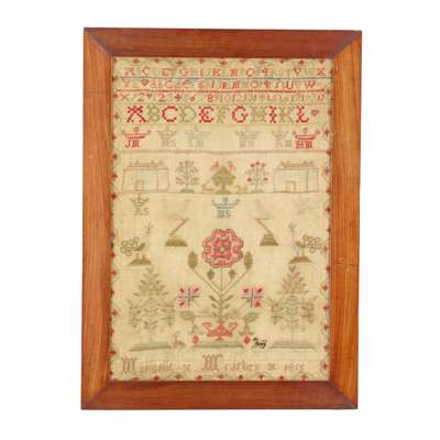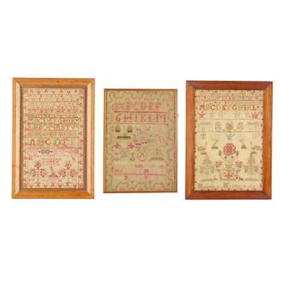 silk and wool on linen, the first worked by Margret M[c]rarten[?], dated 1815, with three alphabet and a number series, family initials and coronets, above a field with houses, animals, birds, and flowering pots, in a strawberry border, framed; the second worked by Isabella Watson, dated 1809, with five alphabet series, family initials, two flowering trees and a fruit basket with a bird perched on top, in a flowering vine border, framed 41.5cm x 26cm; the third with two alphabet series, and a central field with flowering pots, trees, and baskets, with family initials in a flowering vine border, framed, 41.5cm x 29cm