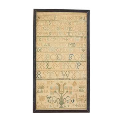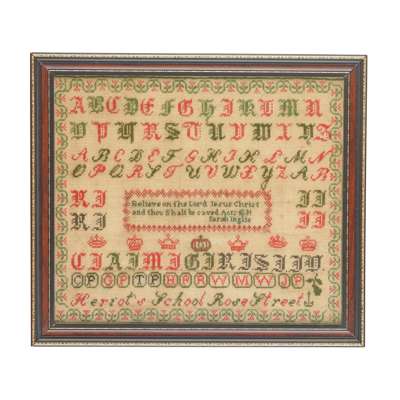 silk and wool on linen, the first worked by Sarah Inglis, dated 1834, with a central verse 'Believe in the Lord Jesus Christ/ and thou shalt be saved.' with two alphabet series, family initials, and 'Heriot's School Rose Street', within a flowering vine border, framed; the second worked by L Meien[?], dated 1825, with three alphabets and a number series, a central flowering pot, coronets, birds, and animals, framed