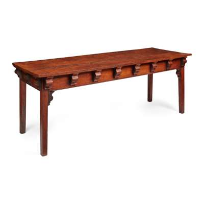 in the veneered top above a frieze with moulded brackets, raised on square tapered legs