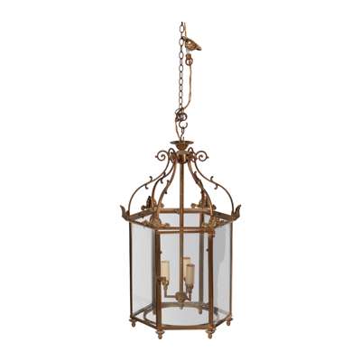 of hexagonal form with glazed panel sides and anthemion mounts, fitted for electricity