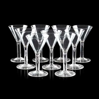 the trumpet bowls on plain extruded stems with air tears on conical circular folded foot; comprising nine large wine glasses, ten smaller wine glasses, and six liqueur glasses