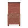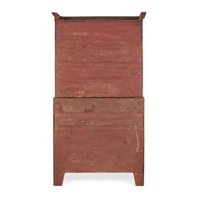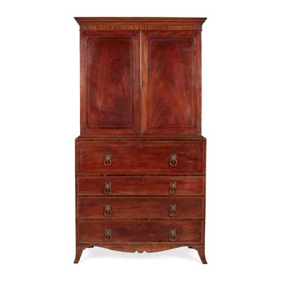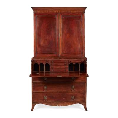 the moulded cornice over a pair of line inlaid panel doors opening to adjustable shelves; the lower part with a fitted secretaire drawer over three long drawers with pressed brass lion's mask handles, above a shaped apron and raised on French bracket feet