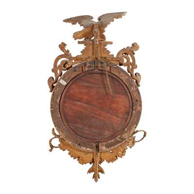 the circular convex plate in an ebonised reeded slip and deep moulded frame with eagle surmount and leaf scroll pendant, issuing two scrolling candle arms