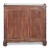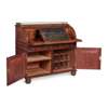 the brass gallery top above a cylinder close opening to an arrangement of pigeon holes and drawers and a pull-out slide with ratchet adjusted leather writing slope, above a pair of short frieze drawers and pair of cupboard doors enclosing shelves and a further pigeon holes with alphabet labels, raised on reeded bun feet with brass castors