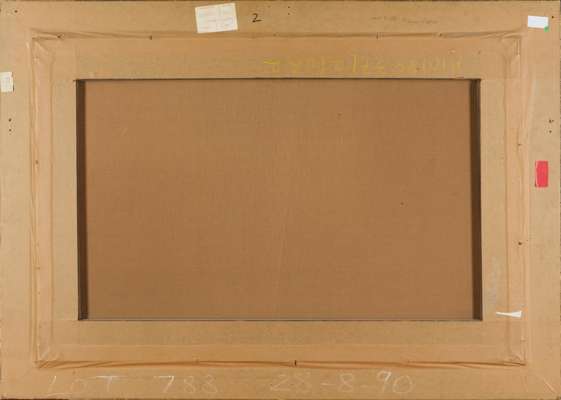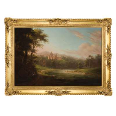 RIVER LANDSCAPE WITH TRAVELLERS ON A PATH, CASTLE RAMPARTS BEYOND